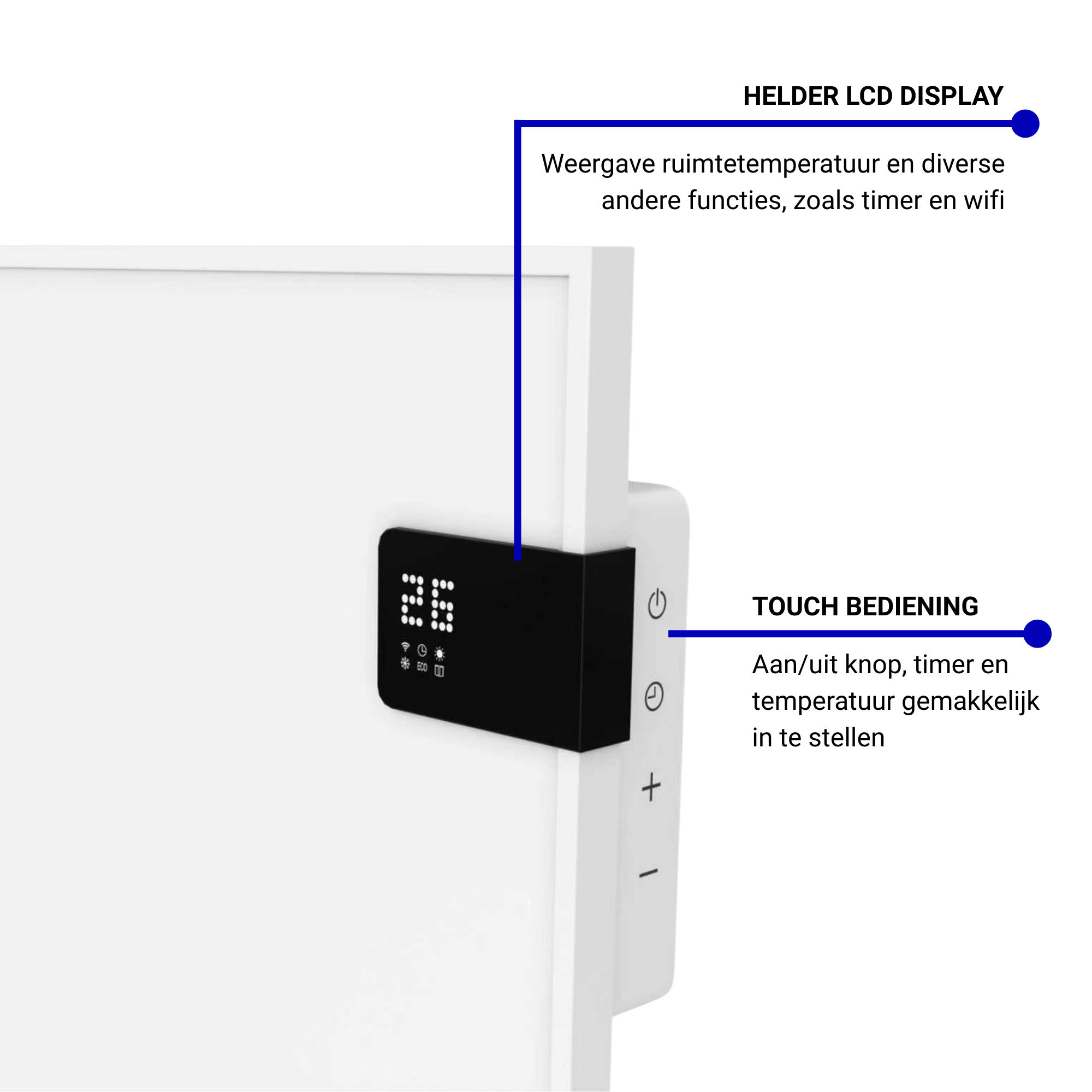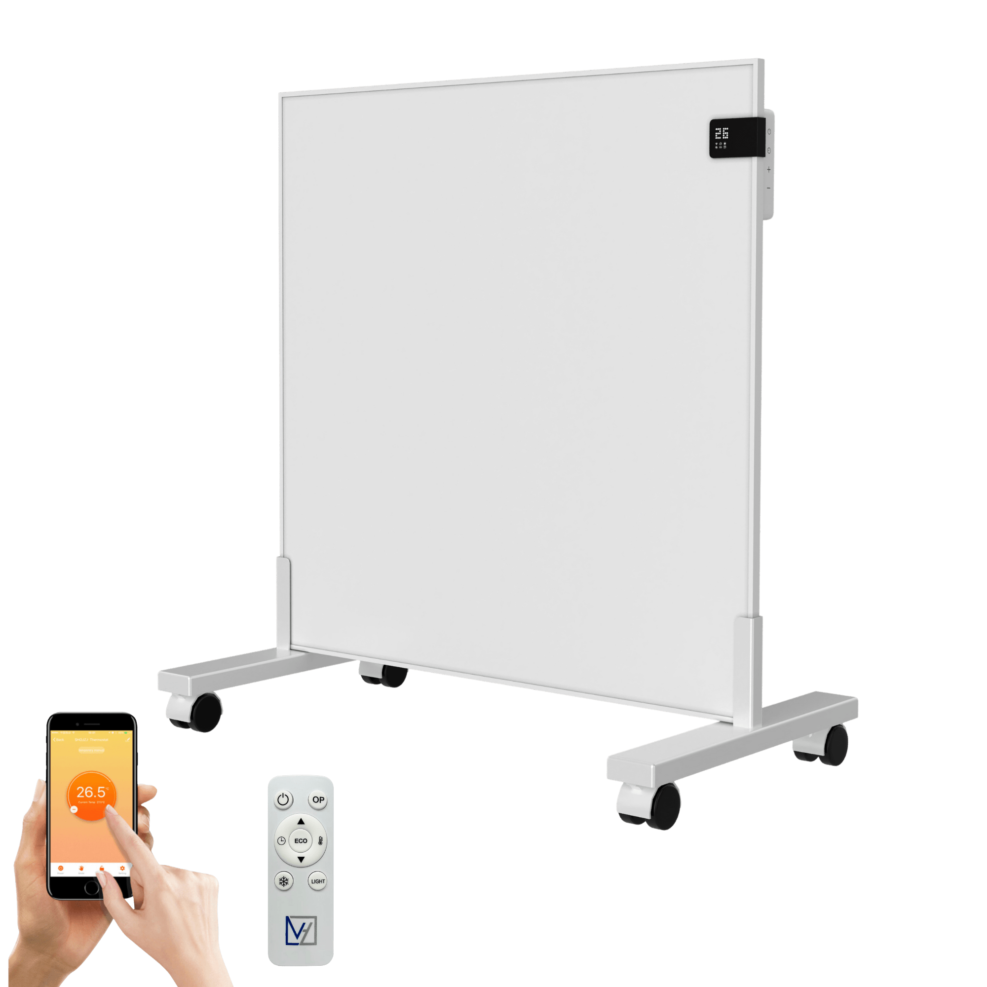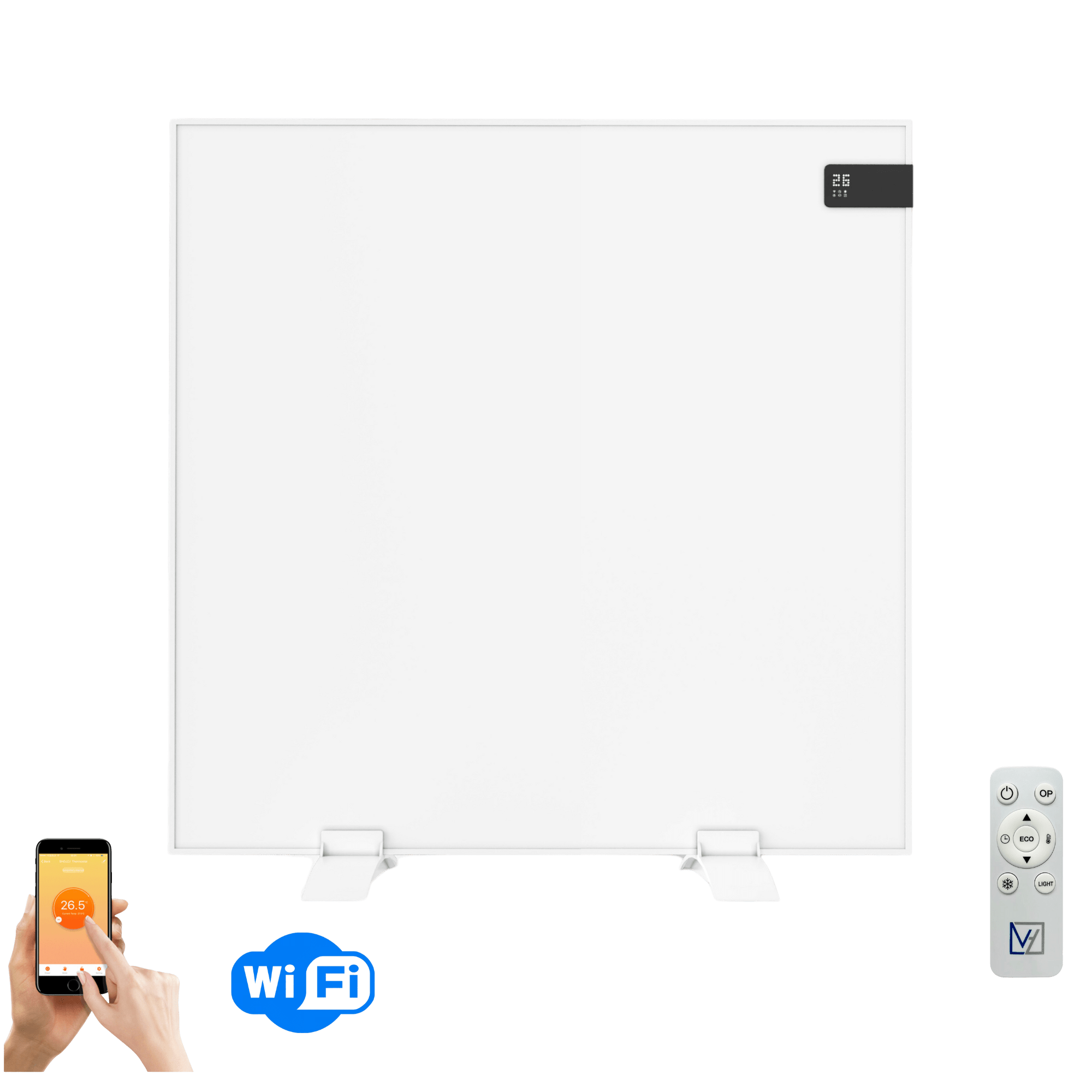 Dankzij de slimme geïntegreerde thermostaat met wifi is dit een echte Plug&Heat oplossing. De thermostaat is te bedienen met de knoppen aan de zijkant van het infrarood paneel, met aan de voorkant een stijlvol zwart scherm voor het tonen van de temperatuur. Het paneel kan door de wifi functie ook vanaf afstand worden bediend middels een (gratis) app van Tuya. En voor extra gemak wordt er ook nog een afstandsbediening meegeleverd.